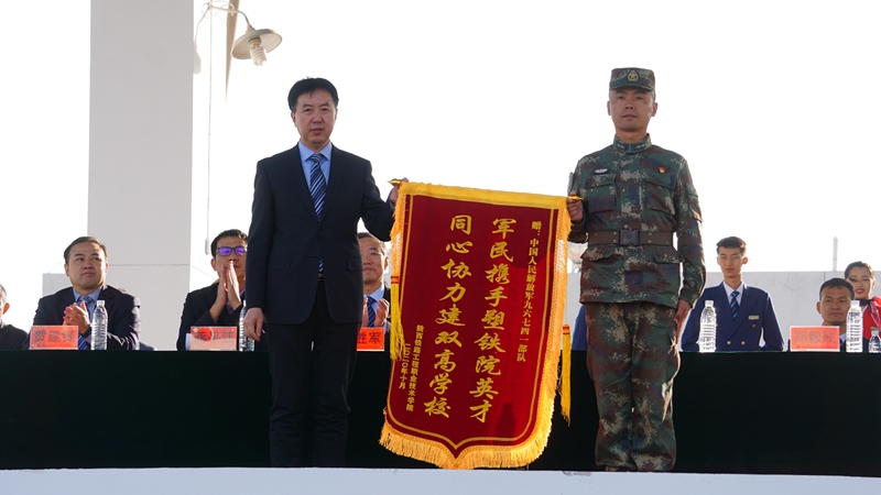 王津代表学校向承担此次军训任务的中国人民解放军96741部队赠送了锦旗,感谢他们在本次军训活动中付出的辛勤付出。