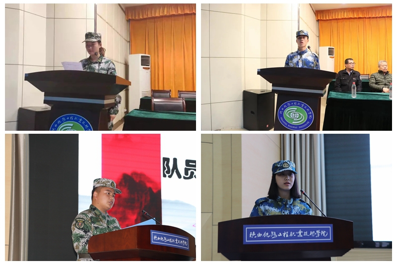 运输学院高乘3191班贺思琪和高铁学院铁工3193班马森同学代表老队员发言,他们认真回顾了在过去一年里和队友们同甘共苦、栉风沐雨为维护校园安全稳定和师生生命财产安全所付出的努力,深情阐述了“护校队”三个字在内心深处的分量和价值。装备学院机械3203班金旭江同学和高铁学院建信3203班杜怡同学代表新队员发言,他们讲到通过与队友们不到二个月的朝夕相处,深切感受到护校队员为了学校的安全稳定和师生的生命财产安全付出的努力,明白了平安校园是因为有很多人默默守护,很骄傲能成为这支朝气蓬勃、极具奉献精神队伍中的一员并表示要大力发扬“护校精神”,紧握接力棒,跑出加速度,干出新精彩!