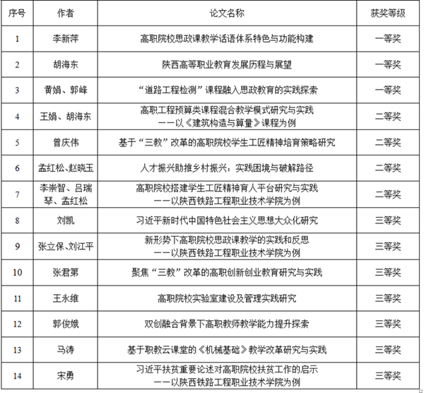 近日,陕西省职业技术教育学会下发《关于公布陕西省职业技术教育学会2020年度优秀职教论文评选结果的通知》(陕职学〔2020〕119号),学校共有14篇论文获奖,其中一等奖3篇、二等奖4篇、三等奖7篇。 据悉,本次评选共有全省26所院校报送参评论文618篇。学会经论文资格审查,知网查重(文本复制检测)、初评、终审等环节,最终评选优秀论文352 篇,其中:一等奖60篇、二等奖114篇、三等奖178篇。(张君第)