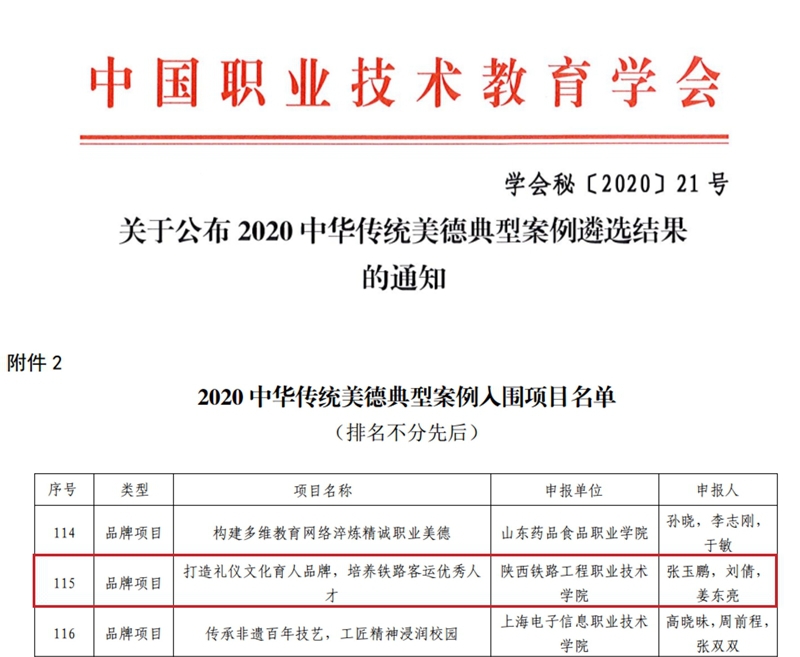 近日,中国职业技术教育学会公布了2020中华传统美德典型案例遴选结果。由学校张玉鹏、刘倩、姜东亮申报的《打造礼仪文化育人品牌 培养铁路客运优秀人才》案例,获评2020中华传统美德典型案例入围项目(品牌项目)。