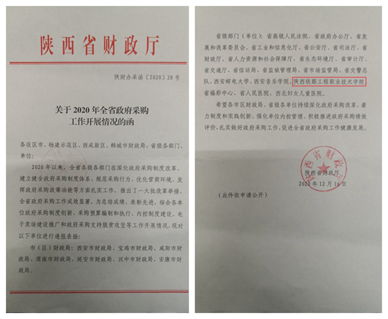 近日,陕西省财政厅发布《陕西省财政厅关于全省政府采购工作开展情况的函》(陕财办采函〔2020〕28号),对全省政府采购工作开展先进的二十八家单位予以通报表扬。学校属全省获得通报表扬的三所高校之一,其余两所为本科院校。