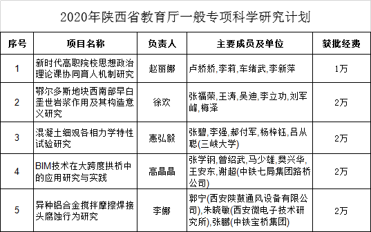 获批计划分别为:赵丽娜主持的项目《新时代高职院校思想政治理论课协同育人机制研究》,徐欢主持的项目《鄂尔多斯地块西南部早白垩世岩浆作用及其构造意义研究》,惠弘毅支持的项目《混凝土细观各相力学特性试验研究》,高晶晶主持的项目《BIM技术在大跨度拱桥中的应用研究与实践》,李娜主持的项目《异种铝合金搅拌摩擦焊接头腐蚀行为研究》。(赵晓玉)
