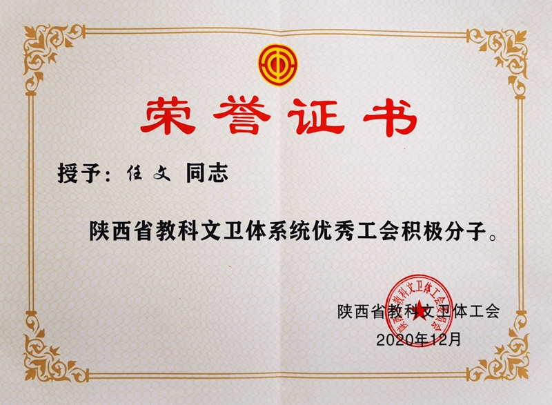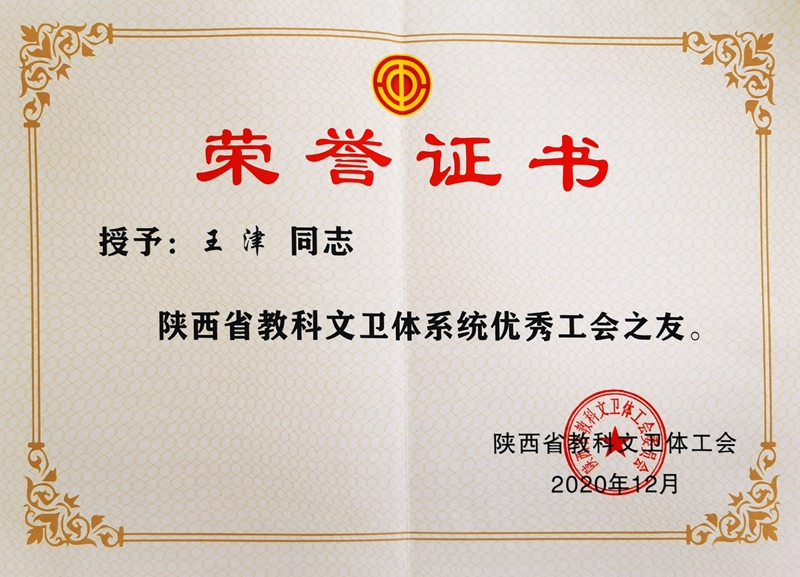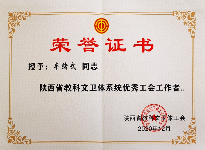 省教科文卫体工会《关于表彰陕西省教科文文体系统模范职工之家、模范职工小家、优秀工会工作者、优秀工会积极分子、优秀工会之友的通报》(陕教科文卫体工字〔2020〕46号)授予学校高铁分会“陕西省教科文卫体工会系统模范职工小家”称号;王津同志“陕西省教科文卫体工会系统优秀工会之友”称号;车绪武同志“陕西省教科文卫体工会系统优秀工会工作者”称号;任文同志“陕西省教科文卫体工会系统优秀工会积极分子”称号。