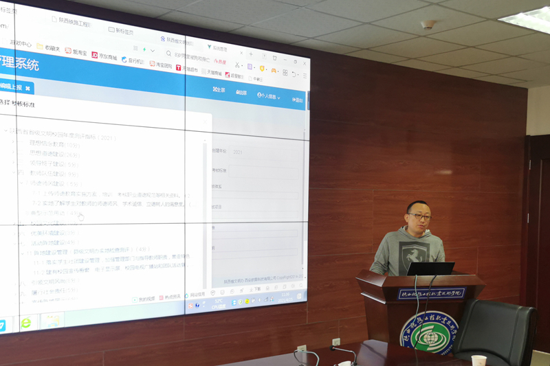 机关第一党总支书记、党委宣传部副部长张玉鹏介绍了学校省级文明校园创建工作的具体做法。学校省级文明校园网络系统负责人杨光对该系统的操作流程进行了介绍,对省级文明校园网络测评指标进行了讲解,同时对该项工作日常遇到的问题进行了经验分享。