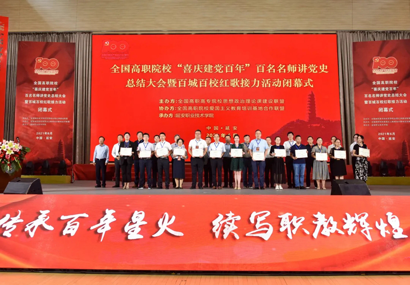 为迎接中国共产党建党100周年,讴歌党的伟大功绩,激励广大师生不忘初心、牢记使命、砥砺前行,全国高职院校爱国主义教育培训基地合作联盟联合全国百所高职高专院校开展了“百城百校百万师生喜迎建党100周年”红色歌曲接力活动。并于2021年6月18—20日在延安职业技术学院召开喜迎建党100周年红色歌曲接力活动闭幕式暨红色文化学术研讨会。