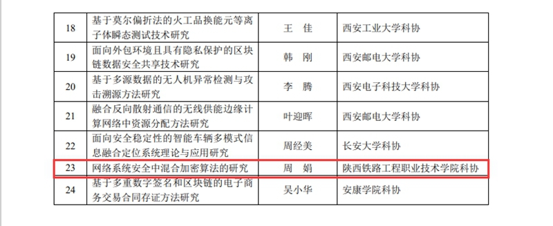 根据陕西省科学技术协会6月29日下发的《关于陕西省高校科协青年人才托举计划项目(2022-2023)立项的通知》(陕科协发〔2021〕事企字10号),学校科协积极组织,邀请三位校外专家评审指导,推荐的周娟老师的《网络系统安全中混合加密算法的研究》项目,成功获得省科协立项资助。此次获批立项的共有100个项目,学校是陕西省唯一获批立项的高职院校。