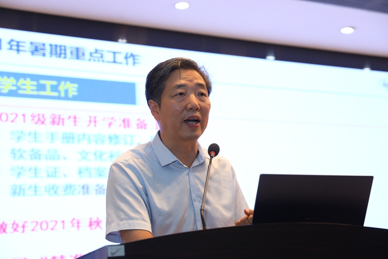 会上,校长焦胜军对2021年暑期工作作了安排部署。他对暑期工作从15个方面60余项工作作了详尽部署,并提出了具体要求。重点强调了“双高”建设、“师生员工培训”、“后勤保障服务”、“疫情防控”、“校园安全稳定”、“大型活动承办”等工作。