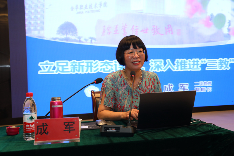 金华职业技术学院成军教授主讲《立足新形态课堂,深入推进“三教”改革》。她提出了对中国特色高水平高职院校建设的三层认识,从推动课程改革建设、深化课堂教学创新、提升教师教学能力三个方面阐述了如何让课程“新”起来、让课堂“活”起来、让教师“强”起来、结合案例对模块化课程改革进行分析解读,传授工作经验。
