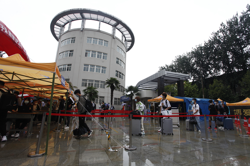 志愿者排队等候新生入校,“一对一”为新生服务