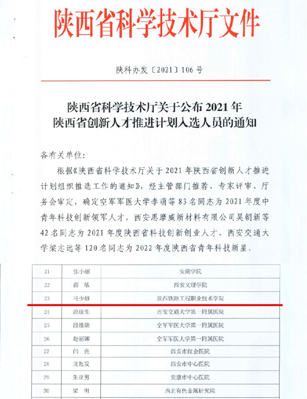 近日,陕西省科学技术厅印发《关于公布2021年陕西省创新人才推进计划入选人员的通知》(陕科办发〔2021〕106号),学校马少雄博士入选2021年度陕西省创新人才推进计划中青年科技创新领军人才。