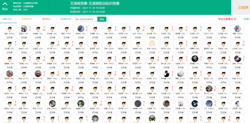以赛促学,激发学习活力。学校后勤保障处、学校卫生所、学生处联合举办“2021年大学生艾滋病防治知识竞赛活动”。积极发动、周密组织、全员参与,结合疫情防控的需求,充分利用“云课堂智慧职教”组织线上学习,线上竞赛。竞赛考题分为多选、单选、判断等形式;竞赛共50道题,答题时间为60分钟,每题2分,满分100分;题目乱序,单选、多选选项乱序。多选题计分方式为:错选不得分;少选时,按照选项个数计分。经过层次选拔,2390人参加的线上竞赛,其中满分达130余人。