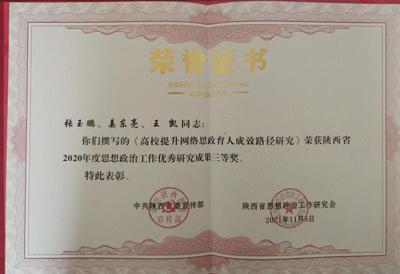 近日,中共陕西省委宣传部下发文件(陕宣字〔2021〕262号),对陕西省2020年度思想政治工作优秀研究成果进行表彰通报。学校党委宣传部张玉鹏、姜东亮、王凯申报的成果《高校提升网络思政育人成效路径研究》荣获三等奖,实现了我校在省级思想政治工作优秀研究成果上的零的突破。