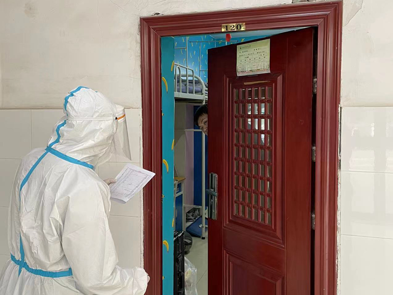 通知一出,学校疫情物资配送登记系统后台陆续收到师生提交的物资需求,后勤保障与医务组的工作人员和志愿者团队的同学们就开始忙碌开了,有新的订单提示,工作人员就赶紧打开记录,按照校区、数量、宿舍号,将物资分配好,两校区学生志愿者,身着“大白”, 主动上门为师生送去防疫物资。