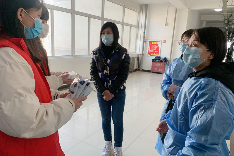 胡静静为志愿者发放防疫物品