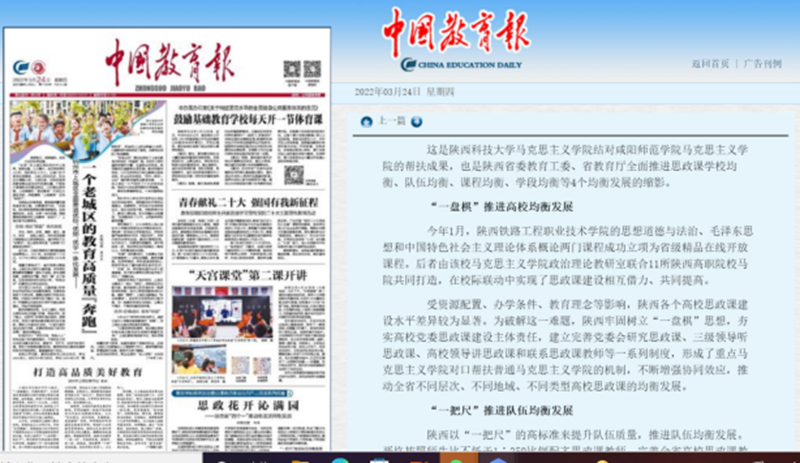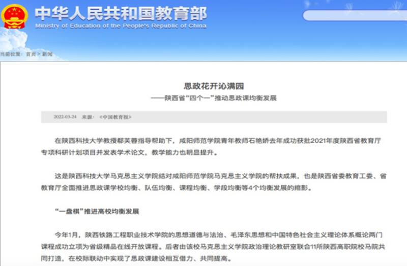 3月24日,《中国教育报》头版和中华人民共和国教育部政府部门网站刊登文章《思政花开沁满园——陕西省“四个一”推动思政课均衡发展》,充分肯定学校思政课建设在促进学校均衡发展方面形成的突出成果。