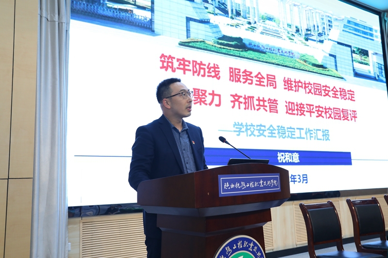祝和意总结了学校2021年安全稳定工作,安排部署2022年省级“平安校园”评估认定工作任务。他指出2022年国内疫情防控形势依然严峻,常态化疫情防控背景下的校园安全管理难度日益增大,学生安全管理问题不断增多。做好当前学校安全稳定工作:一是提高政治站位,进一步完善安全工作机制;二是要增强忧患意识,扎实开展安全隐患排查整治;三是要筑牢防范意识,抓好安全教育培训演练;四是要增强责任意识,进一步加强校园安全管理;五是要增强政治意识,切实守好校园各类安全阵地,全面维护校园安全稳定,全力为学校“双高”建设保驾护航。