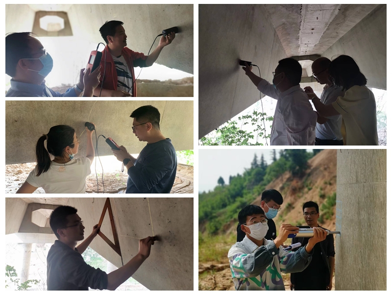 座谈会后,全体参会人员与管理站领导齐赴渭南市临渭区关中环线综合桥开展桥梁养护综合评定工作。在评定现场,道桥教研室教师发挥专业优势,开展墩台混凝土强度、钢筋保护层厚度及碳化深度、梁体裂缝、蜂窝麻烦区域测评等工作,对桥梁锥体护坡冲刷及桩基础承载力检测制定了初步评定方案,就桥梁养护情况进行现场数据交流与研讨,并计划后期将制定专门报告反馈管理站。管理站领导及工作人员对老师们的专业技能表示肯定,并希望尽快开展后续站管辖内五座桥梁的养护评定工作。