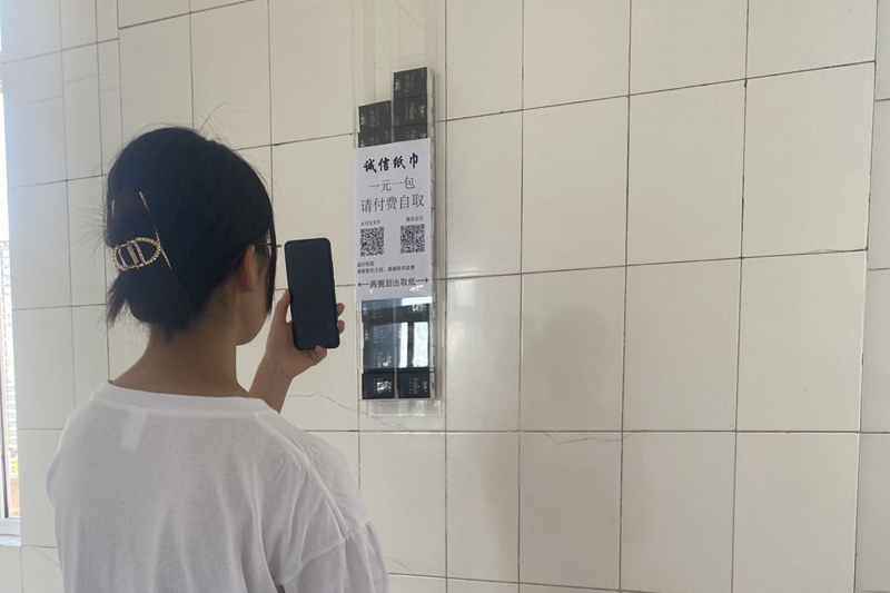 近日来,在临渭校区A楼五楼和B楼五楼出现了一个新的事物,那就是“诚信纸巾”,它被安置在A楼五楼大厅和B楼五楼走廊的墙壁上,在玻璃橱里装着满满的纸巾,玻璃上写着“一元一包”字样,也有支付宝和微信二维码的标识,学生可通过微信或支付宝购买,自行取走购买的纸巾。而这一个自助机器的出现,立刻受到很多学生的青睐,很多学生表示,在去食堂吃饭,去卫生间,尤其是到了夏天擦擦汗等情况下常常忘记带纸巾,这样有了自助纸巾,就方便多了。
