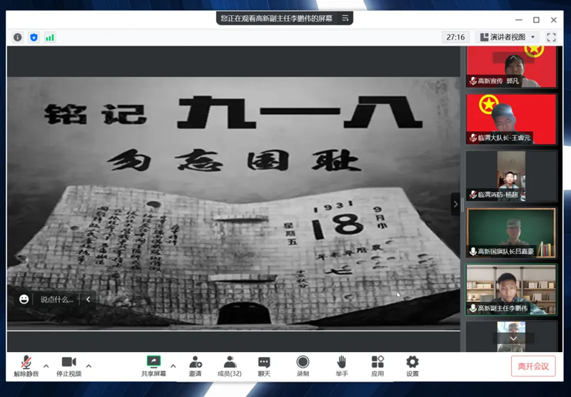 今年的9月18日恰逢震惊中外的“九一八事变”爆发91周年,在这样一个特殊的日子里,学校护校队于9月18日晚在线上开展了以“铭记历史,吾辈自强”为主题的教育活动,再次回首那段不容忘却的历史,教育引导全体队员以史为鉴、珍爱和平、勿忘国耻、吾辈自强。