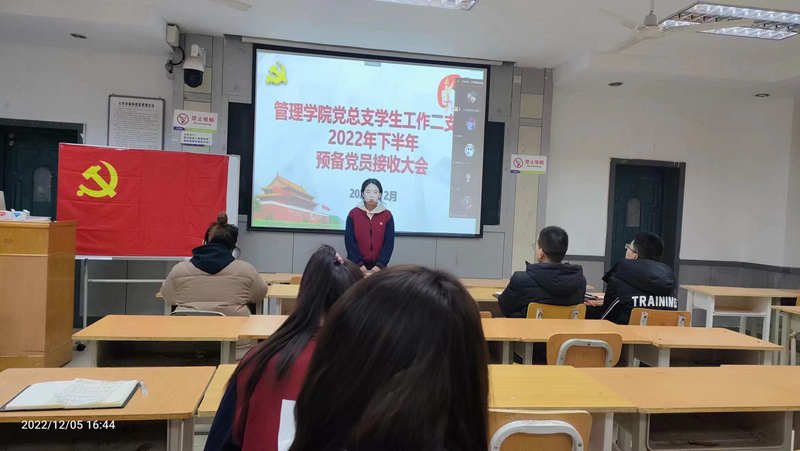 12月5日下午,管理学院党总支学生工作一支部预、二支部预备党员接收大会分别在临渭校区A602教室、B200教室线上线下同时召开。会议讨论接收一支部李江欣等14名同志、二支部杨云等28名同志为预备党员相关事宜,大会分别由党支部书记张雅丽、雷赐涛主持,支部教师、学生党员参会。
