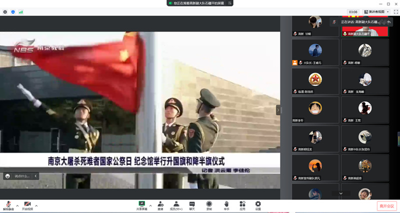 活动中,全体护校队员在线集中观看了国家公祭日升国旗和降半旗仪式,并向南京大屠杀罹难同胞默哀3分钟。随后,高新校区护校队队干部石疆平同学利用国家公祭日主题教育课件,从国家公祭日的设立的原因、设立的意义讲起,阐明国家公祭日的由来。最后,活动在全体队员高唱国歌声中结束。