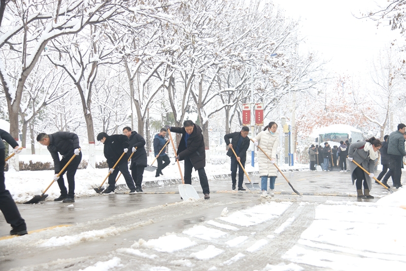 两校区实施分区清扫,由二级学院与职能部门结对完成。天气寒冷却阻挡不住大家的热情,校领导、党员干部带头,广大师生积极参与,分工协作开始清扫校园道路的积雪。大家手持铁锨、雪铲等工具,前者凿、中间铲、后者扫,团结协作、干劲十足,忙碌的身影化作风雪中一道道靓丽的风景线,也为校园开辟出一条条畅通之路。