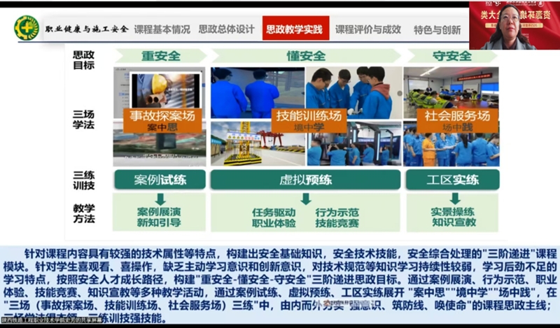 作为国家“双高计划”建设单位代表,学校学院工程管理与物流学院副教授史芳以“三维并轨・三境育人”为主题,进行了职业健康与施工安全课程的说课展示,其课程思政建设成果获得与会专家的一致好评,为安全类专业课程思政建设提供了具有推广价值的“陕铁方案”。
