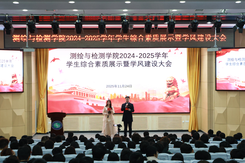 11月24日晚,测绘与检测学院“笃学修能育新人,正风聚力启新程”2024-2025学年学生综合素质展示暨学风建设表彰大会在博爱厅举行。教务处副处长王涛、学生处副处长黄阿岗受邀出席,学院党政班子成员、全体班主任及学生代表共计500余人齐聚现场,共同见证先进风采,共启育人新篇。大会由学院辅导员王浩龙与学生谢琳瑜主持。
