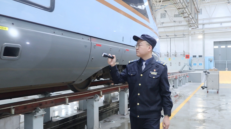 随车机械师孙衍对动车进行例行检查