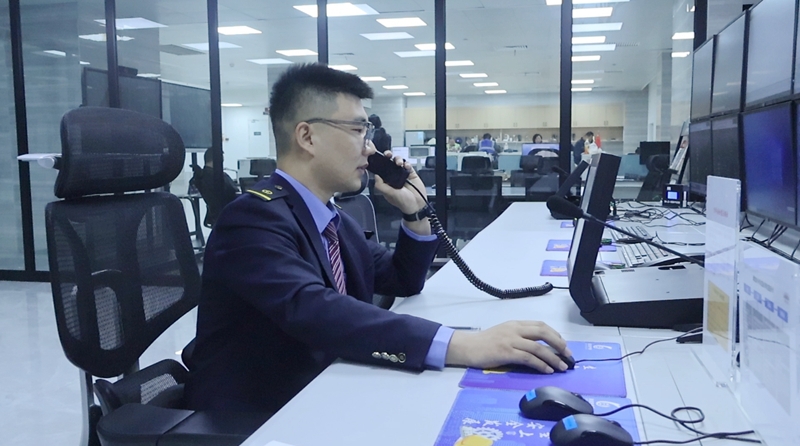 值班员赵炯正在接发列车指令