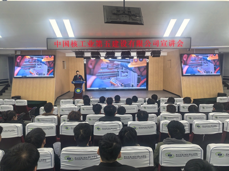 在订单选拔宣讲会现场,中核五公司主系统分公司施工管理部副经理覃明保围绕中核五公司的历史沿革、发展历程、行业地位及全球战略布局,以及企业在核工业、清洁能源、高端装备制造等领域的核心业务与未来发展方向,并就学生关心的订单班组建计划、企业奖学金设置、培训考核办法、薪资待遇、岗位要求等方面进行了重点解读;中核五公司主系统分公司施工管理部招聘主管周江丽则为学生进行了现场答疑,同时对来自智能工程机械运用技术、高速铁路施工与维护、地下与隧道工程技术、道路与桥梁工程技术等专业的93名报名订单培养班学生进行了选拔。