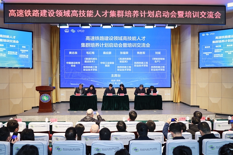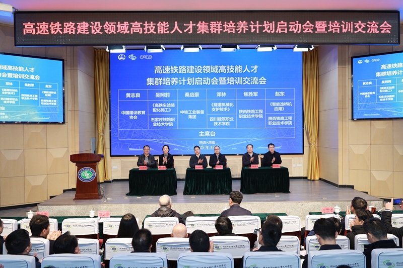 12月24日,由中铁高新工业股份有限公司、陕西铁路工程职业技术学院、中国建设教育协会联合主办的高速铁路建设领域高技能人才集群培养计划启动会暨培训交流会在陕铁院高新校区召开。中国工程院院士卢春房、王景全,中共陕西省委教育工委委员、省教育厅副厅长申雪峰,中铁工业装备集团总经理助理桑应豪,中国建设教育协会副理事长黄志良,中国铁道建筑集团有限公司首席专家任少强,中国国家铁路集团有限公司工务技术中心高级工程师吕关仁,中铁一局集团电务工程有限公司高级技师、全国双百人物、全国劳动模范窦铁成,中铁建工集团有限公司科技质量部部长吴亚东,中国教育科学研究院韩倩博士,高等教育出版社高职事业部主任洪国芬,陕西铁路工程职业技术学院党委书记焦胜军、校长韩小卫出席会议。