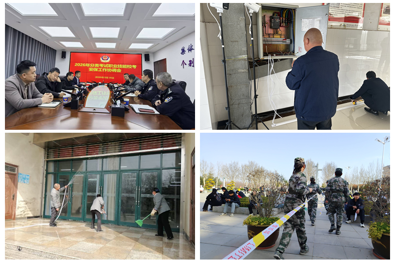 ——未雨绸缪,精心筹备筑根基。校考筹备工作启动后,学校高度重视,第一时间成立专项工作领导小组,形成闭环工作体系。后勤保障与安全保卫处于3月11日起,先后在春季学期工作部署会、外包服务项目工作推进会及各科室专题会议中,对校考保障工作层层部署,压紧压实岗位职责。同时,主动对接渭南市公安局高新分局召开专项协调会,完成重大事项报备,联动交警、民警为校考护航,并对照学校校考工作方案,细化制定专项实施细则及突发事件应急预案,确保各项任务落实落细。在硬件保障方面,工作人员全面排查考场配电箱及线路,规范布设线缆,安装调试监控设备,划分功能区域;治安消防科完成场地布置、区域划分及隐患排查。医疗保障方面,校卫生所在考点设置医疗服务点,配齐急救箱、AED等设备,协调辖区医院派驻救护车驻校。此外,工作人员提前购置安全设施、指示标志等物资,统计并保障一线人员餐食供应,清理考试区域车辆,完成教学楼、实训楼全封闭,对校园重点区域全面清扫保洁,统筹绿化养护、噪音管控等工作,全方位筑牢考前保障防线。
