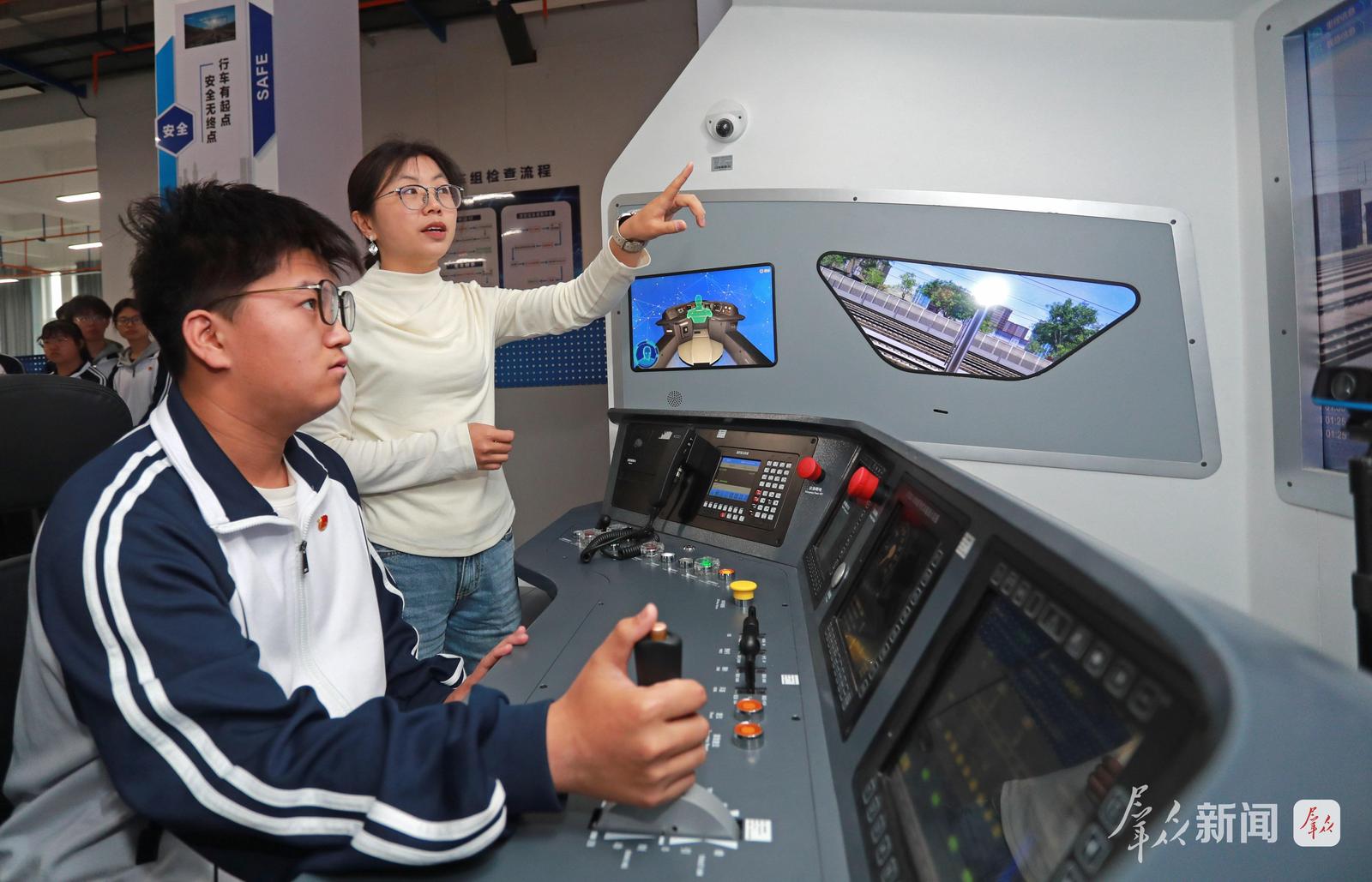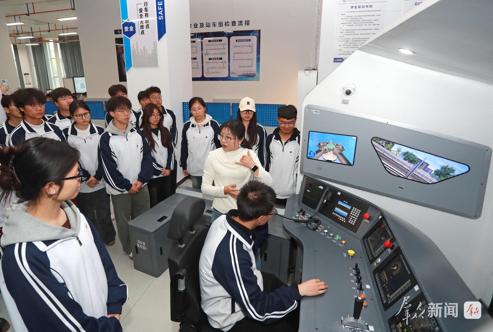 4月21日,陕西铁路工程职业技术学院铁道机车运用与维护实训室,老师给学生讲解驾驶操作知识。